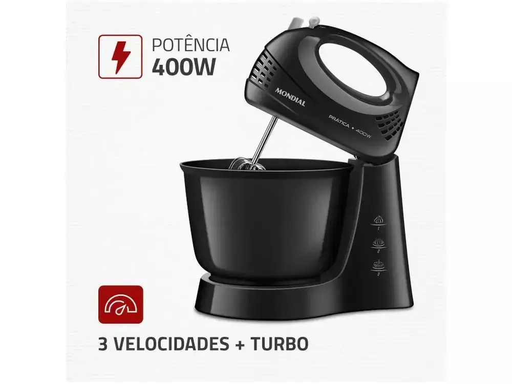 Prepare suas receitas favoritas com muito mais agilidade, eficiência e sabor com a Batedeira Mondial Preta 400W Prática B-44-B - 110V! Perfeita para quem busca desempenho e praticidade no dia a dia, essa batedeira combina design moderno, potência impressionante e funcionalidades inteligentes, tornando o preparo de massas leves e médias uma tarefa rápida e prazerosa.