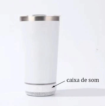 Funções: Copo térmico, tampa antivazamento, abridor de garrafas, caixa de som Bluetooth integrada